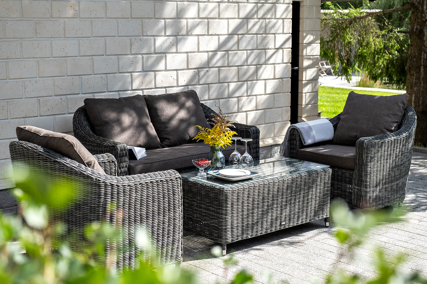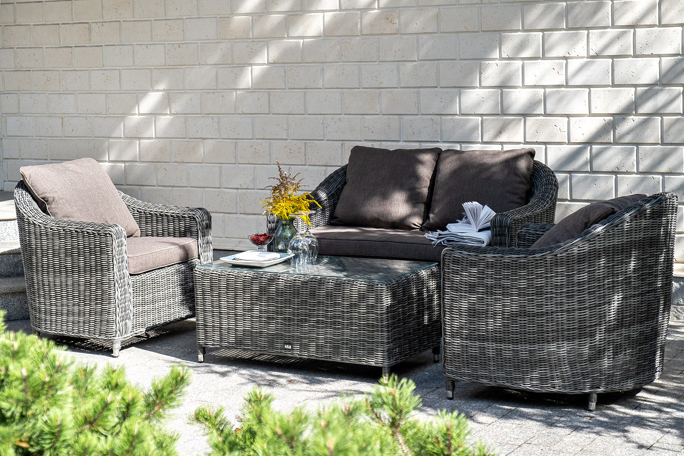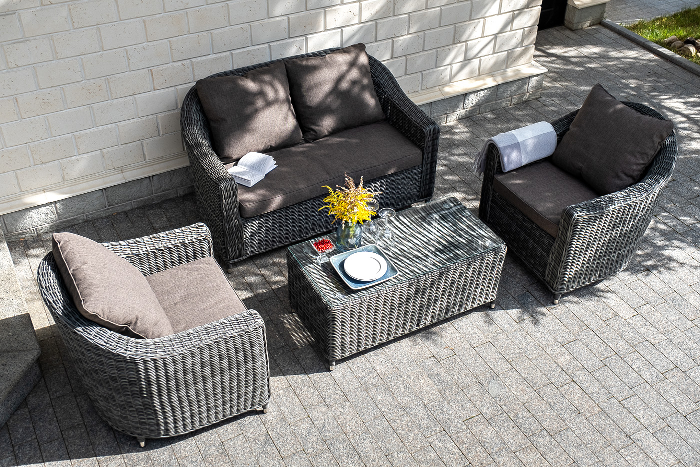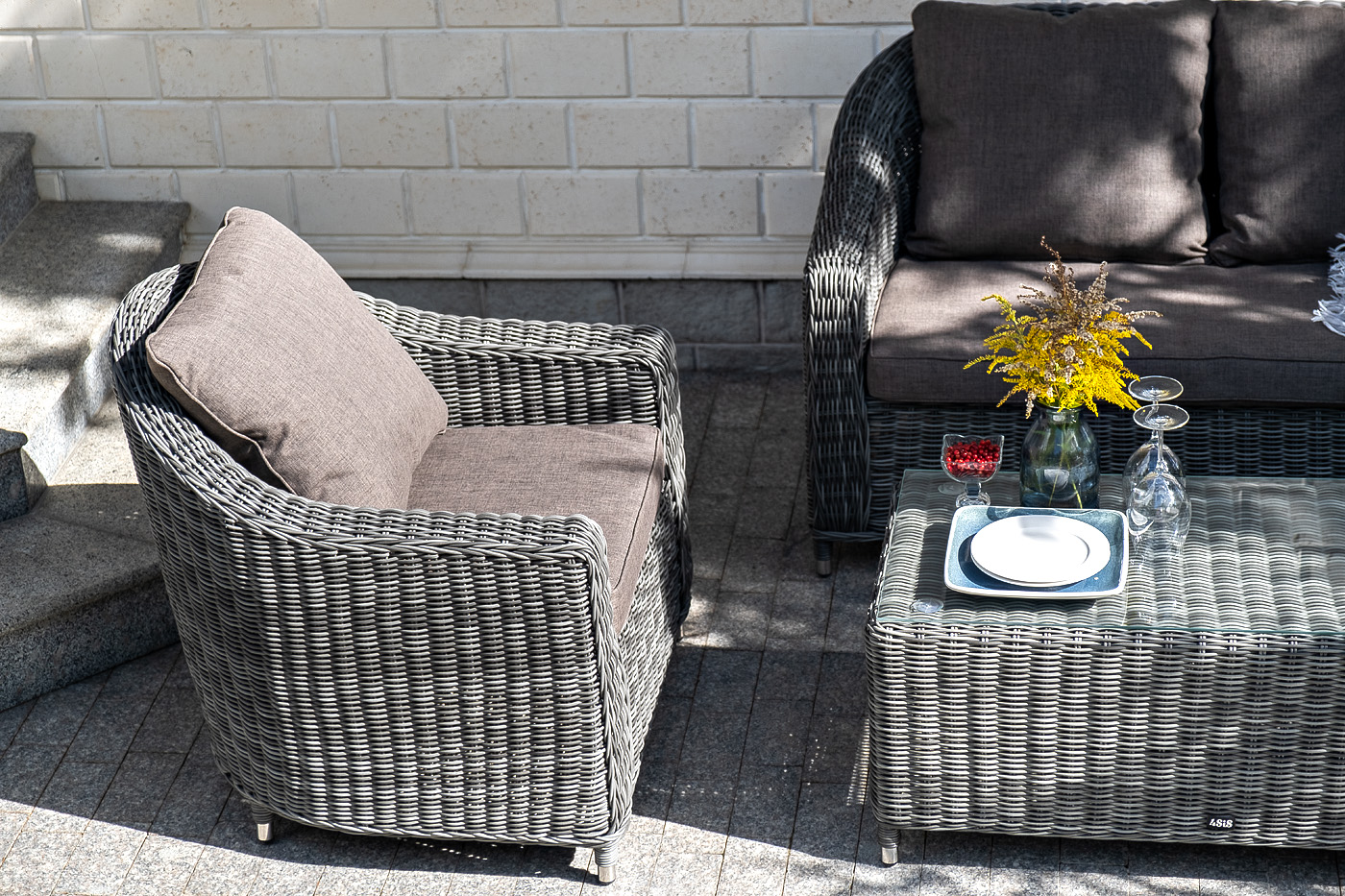 Размер модели – 800×800×800 мм. В качестве основы служит алюминиевый каркас, который оплетен круглым искусственным ротангом графитового оттенка.