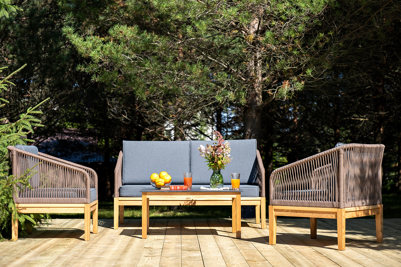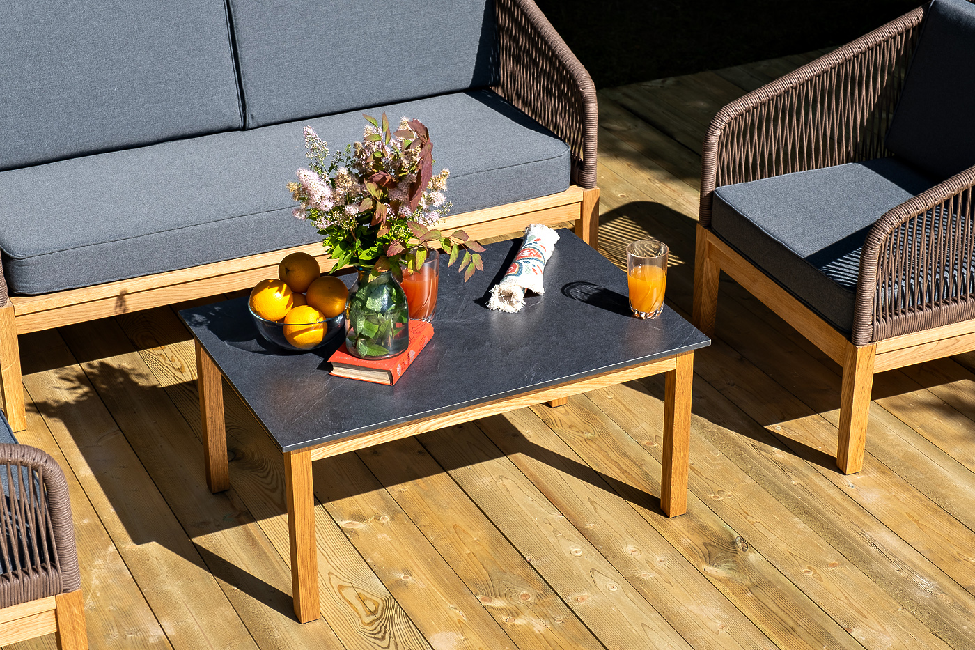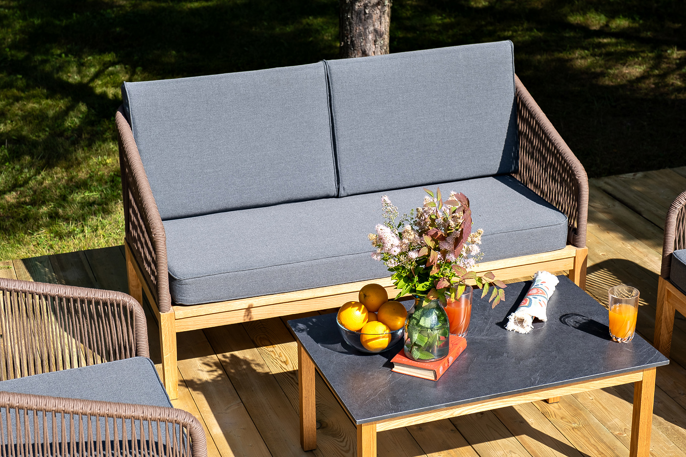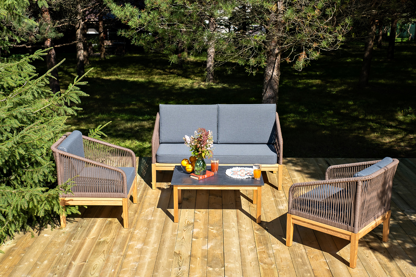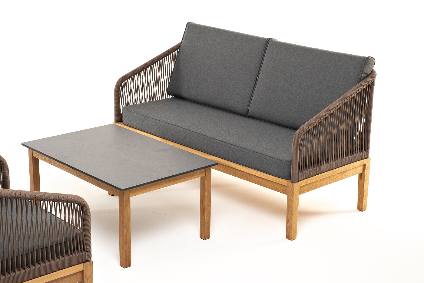 "Канны" лаунж-зона 4-местная из роупа со столиком "Канны" (серый гранит), основание дуб, роуп коричневый