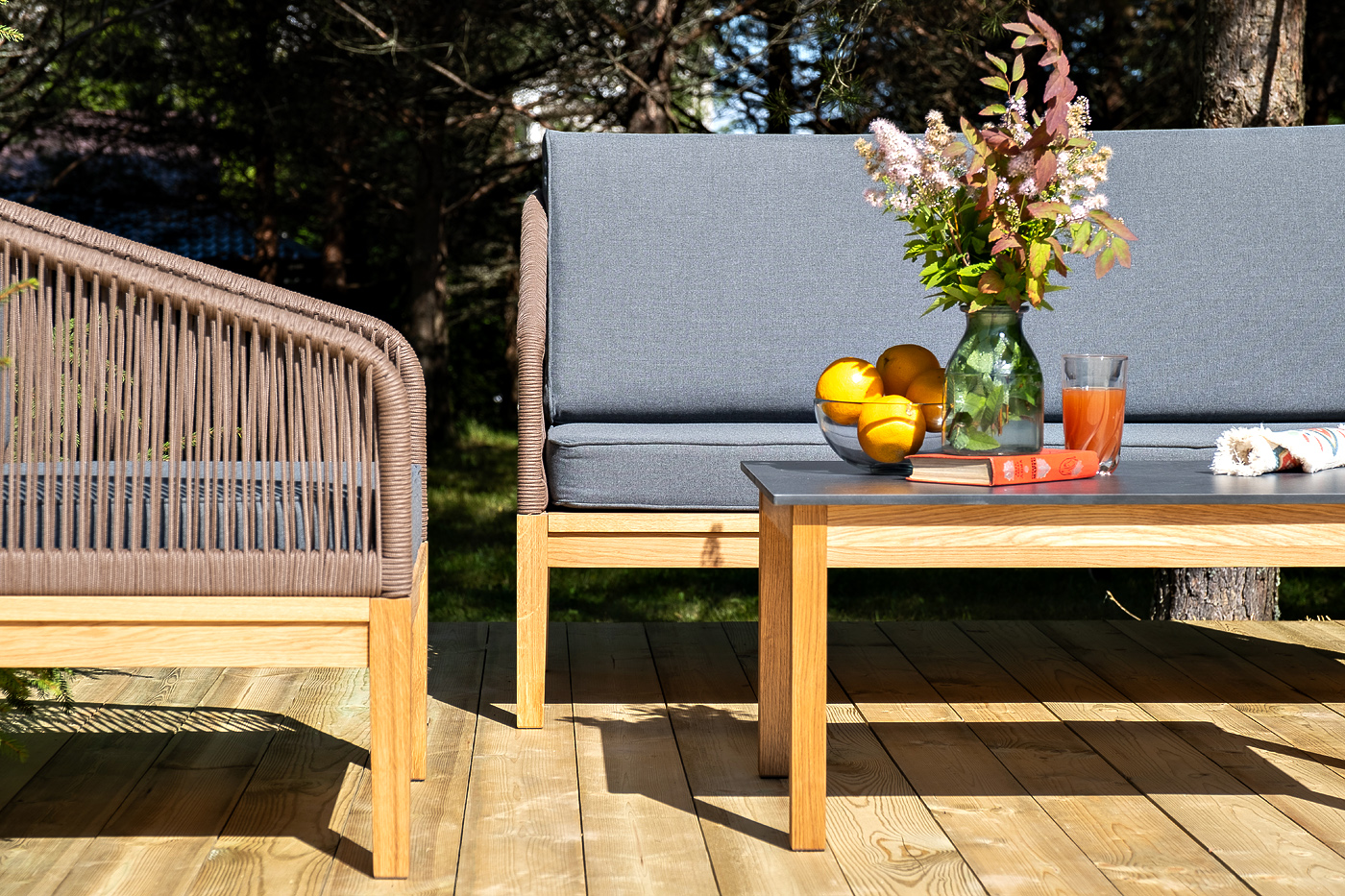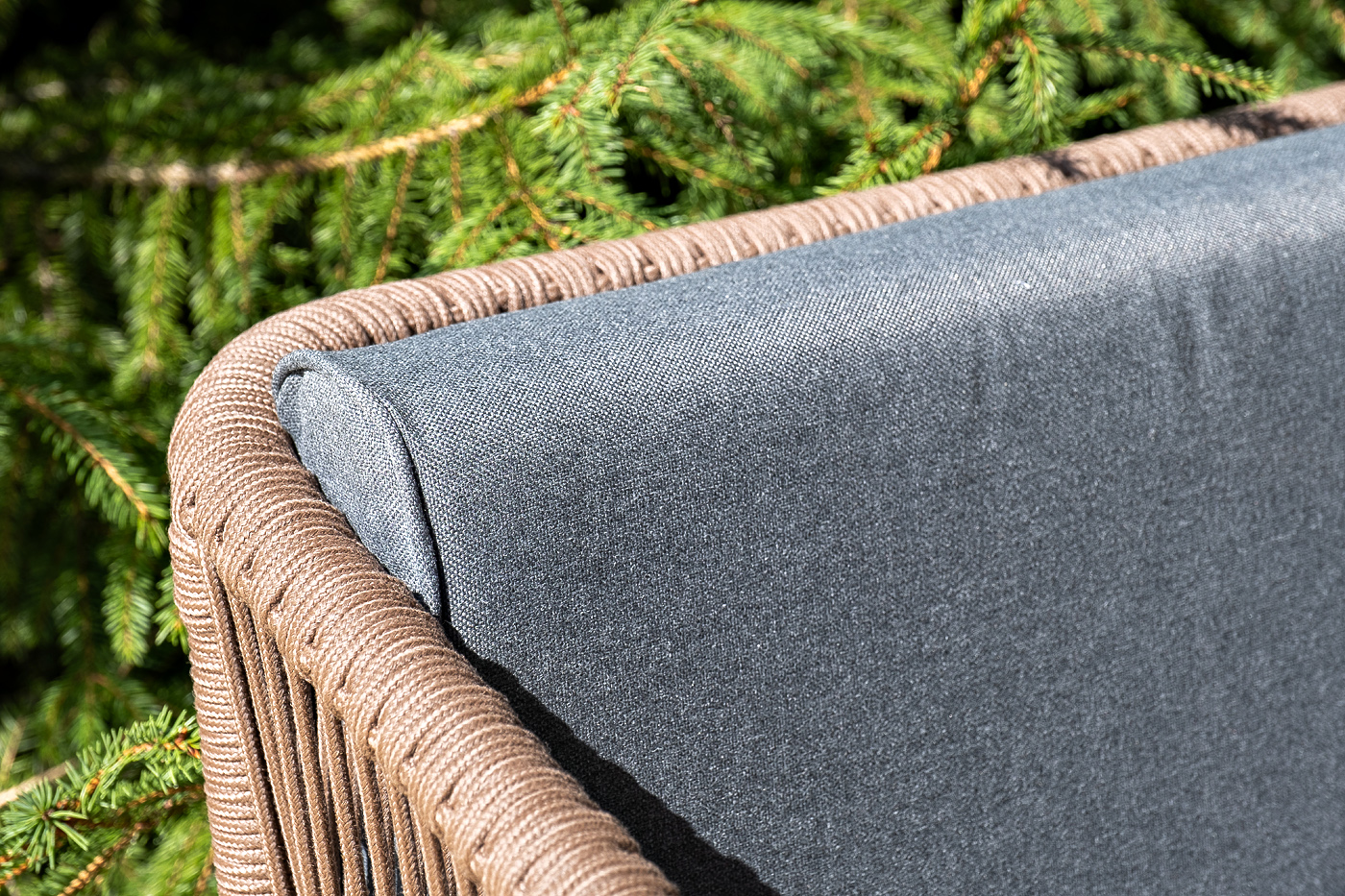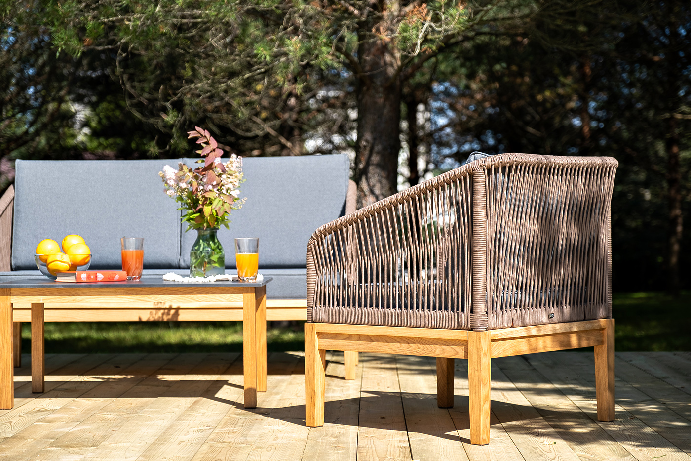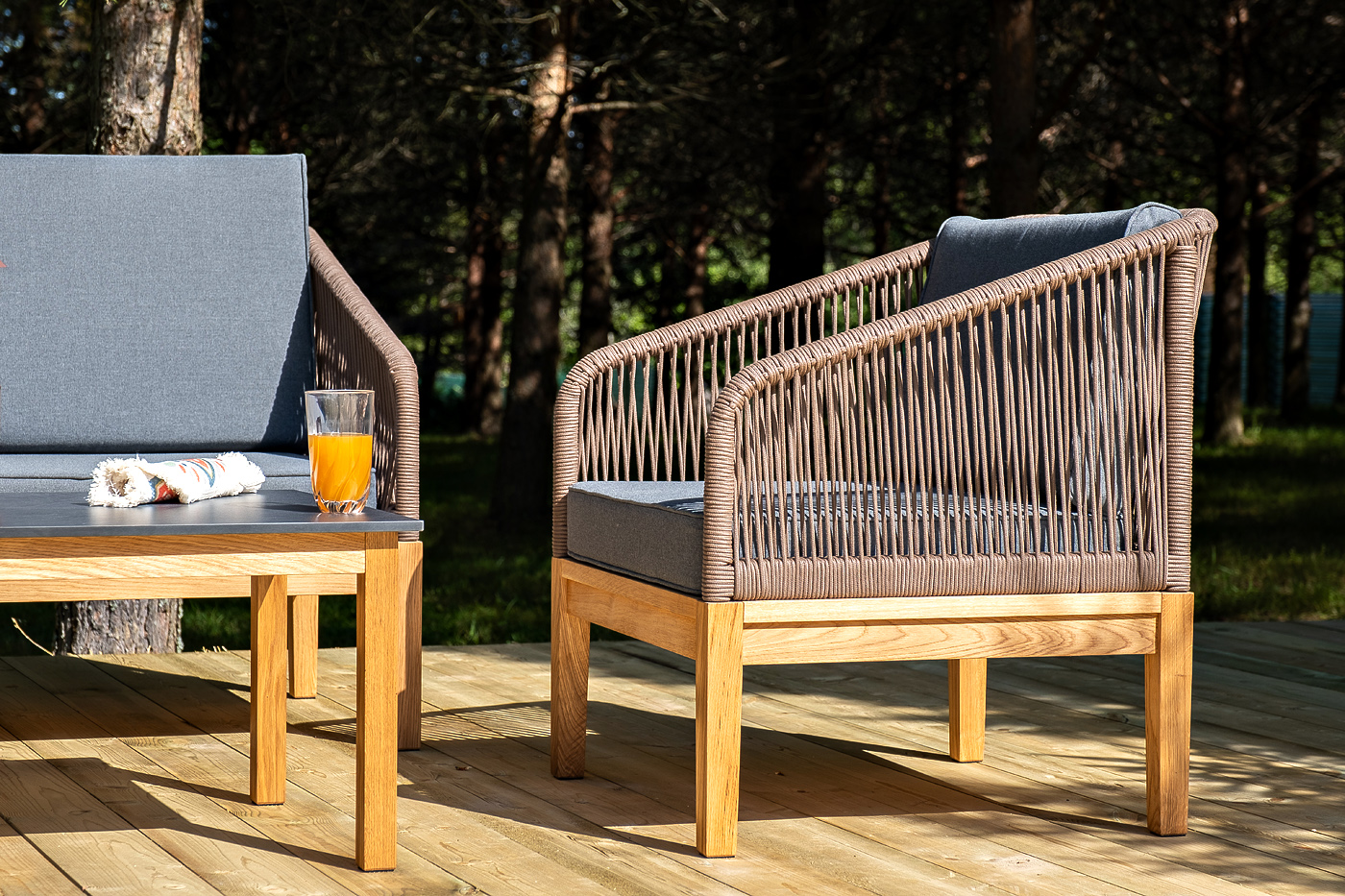 Каркас уличной мебели выполнен из дуба. Его дополняет коричневая оплетка, изготовленная на основе эластичных синтетических лент из полиэфирных волокон высокой прочности.