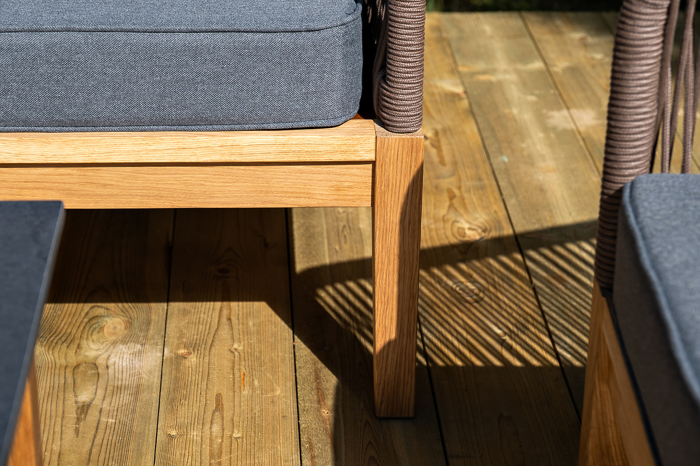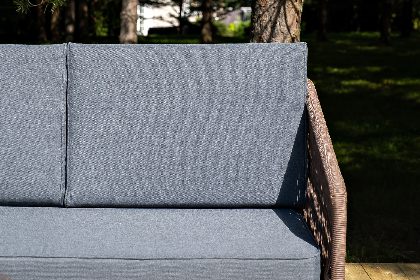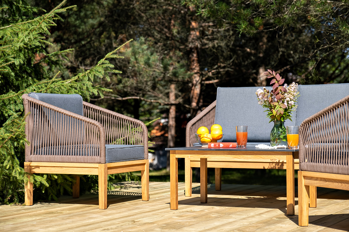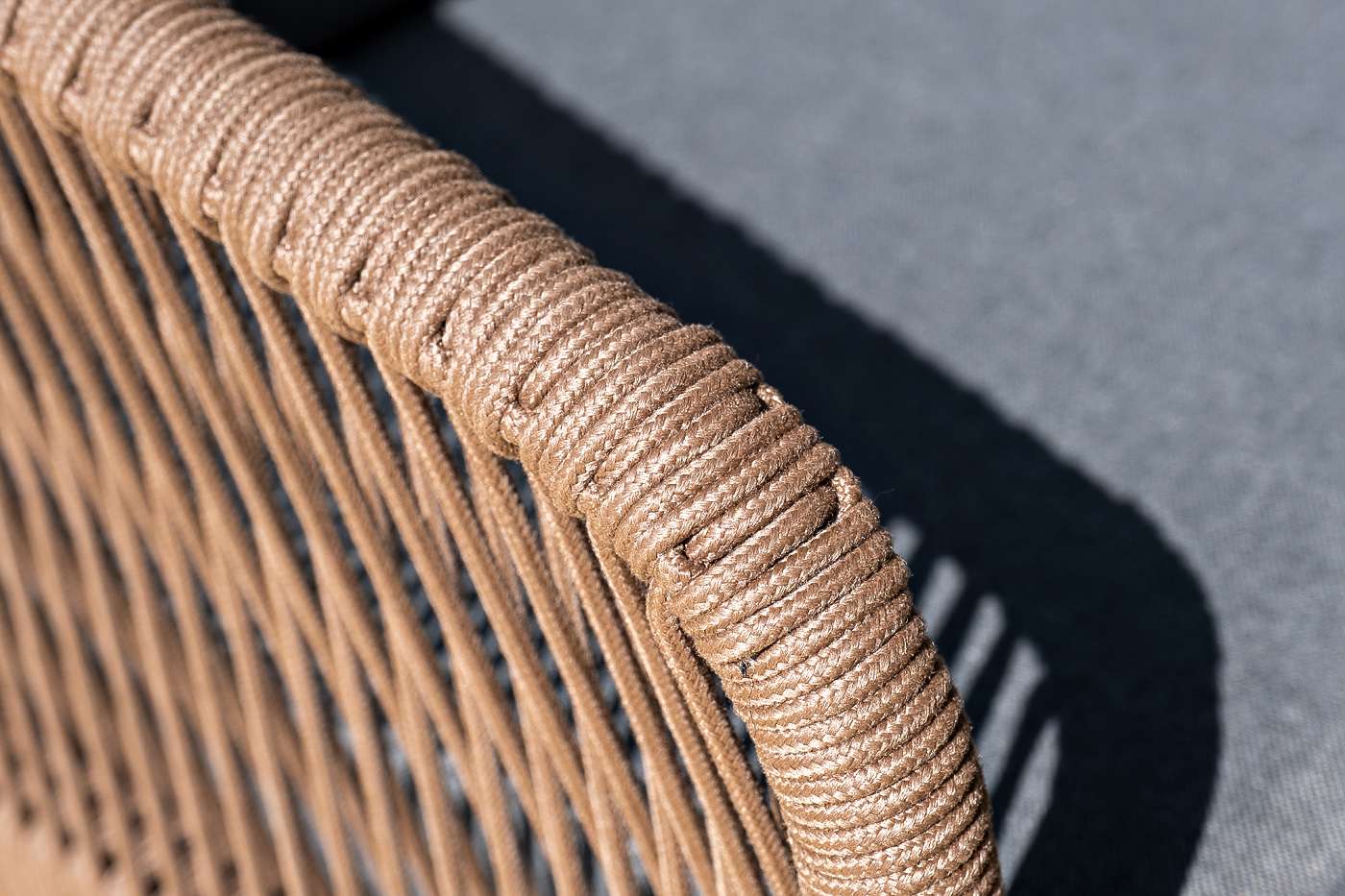 Каркас уличной мебели выполнен из дуба. Его дополняет коричневая оплетка, изготовленная на основе эластичных синтетических лент из полиэфирных волокон высокой прочности.