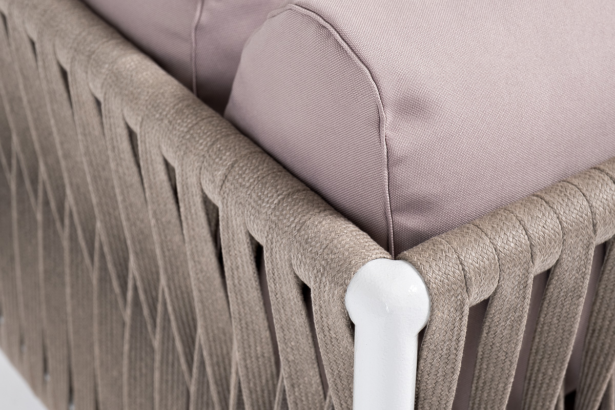 Изготовлен из качественного алюминиевого профиля, окрашенного порошковой краской в светло-серый (RAL7035) цвет. Каркас оплетен плоским роупом, шириной 23 мм, серо-коричневого цвета.