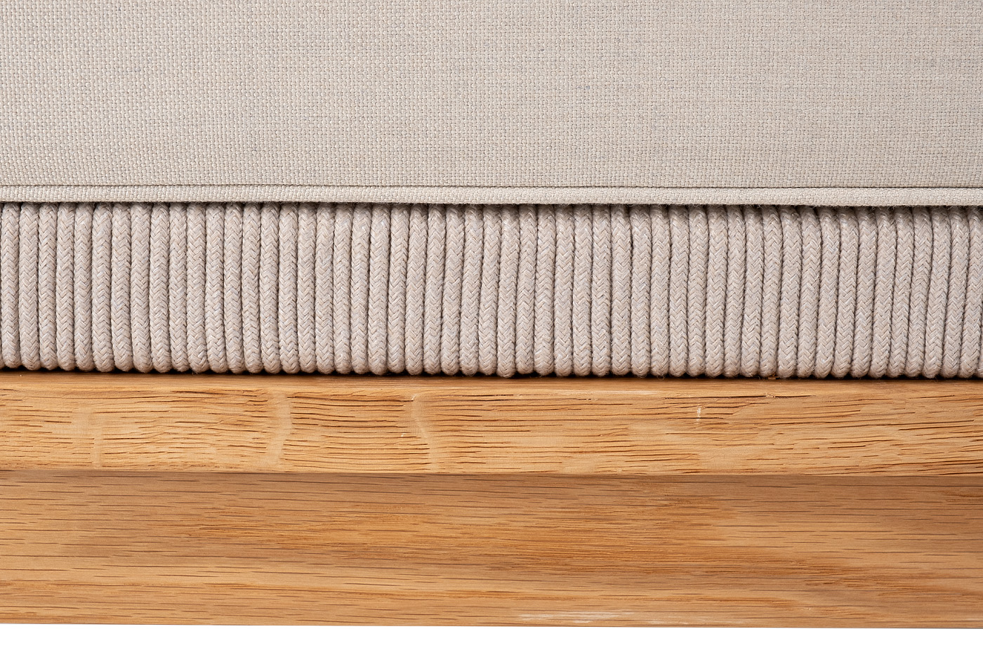 Боковины каркаса вручную оплетены роупом - эластичными синтетическими лентами, изготовленными из высокопрочных полиэфирных волокон. Цвет оплетки - бежевый. Основание дуб.