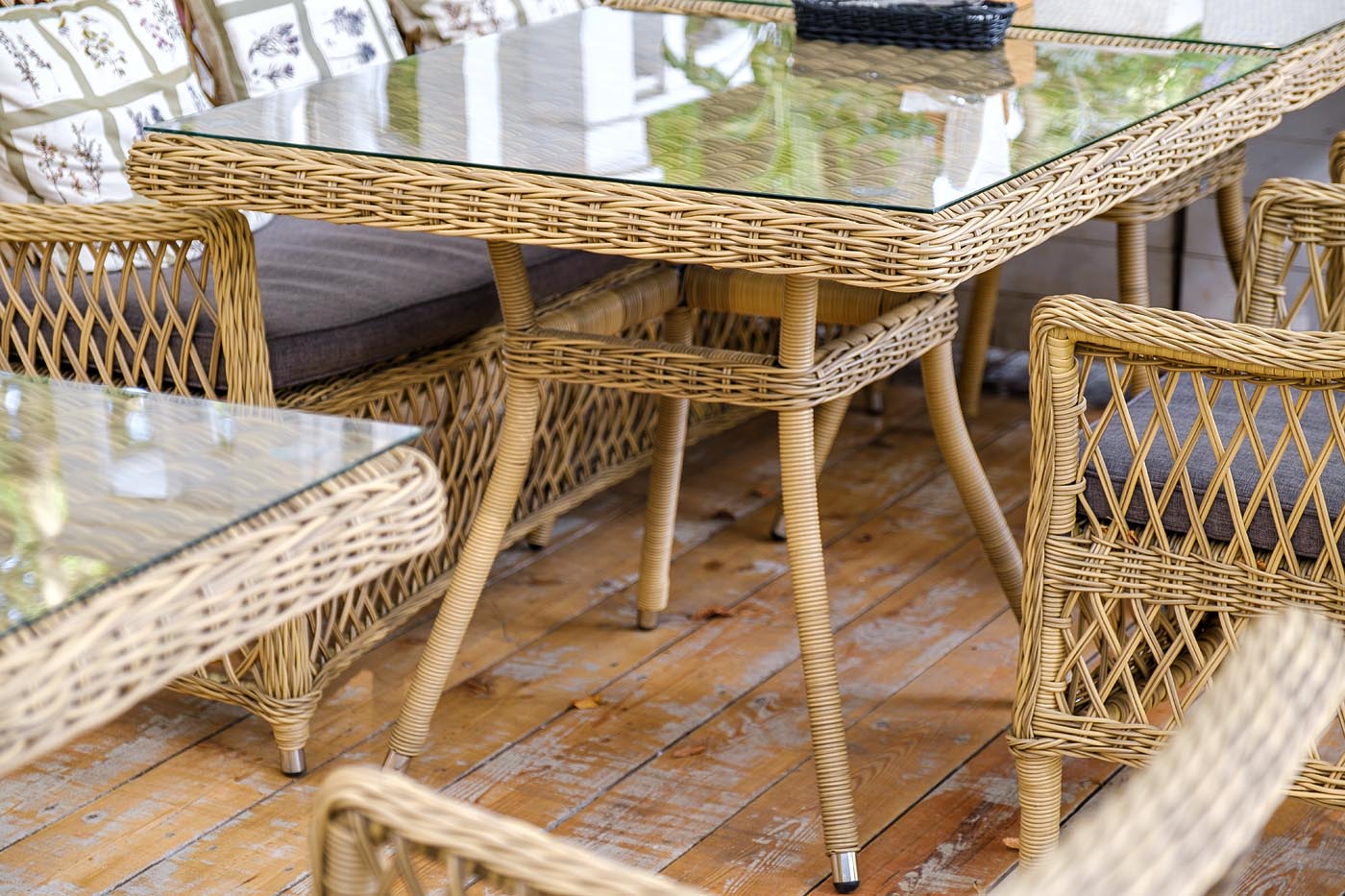 Каркас изготовлен из прочного алюминия, вручную оплетенного круглым искусственным ротангом натурального соломенного оттенка. В качестве столешницы использовано ударопрочное стекло, толщиной 5 мм. На стол можно ставить горячие тарелки и чашки, не опасаясь деформации покрытия.