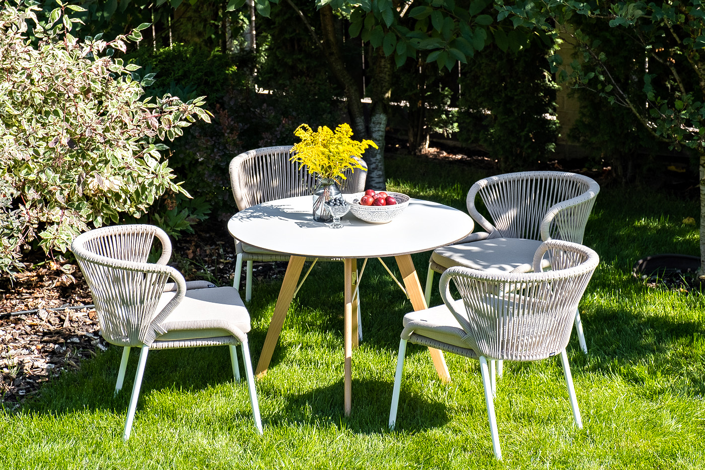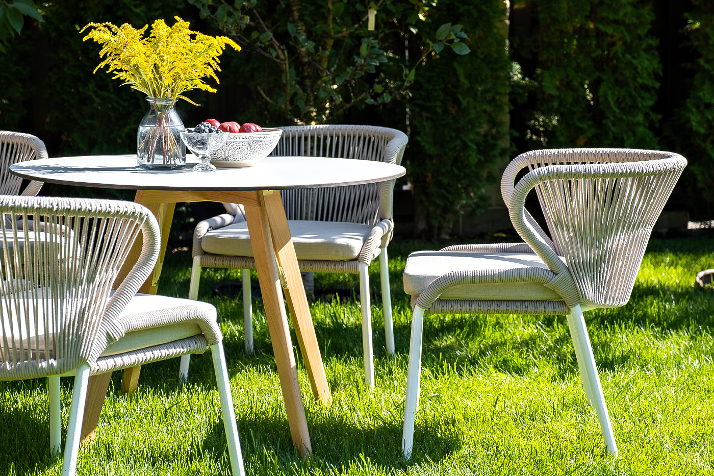 Подстолье выполнено из натурального дерева, с сохранением цвета и фактуры. Столешница - высококачественный монолитный компакт-пластик HPL молочного оттенка. Материал устойчив к механическим повреждениям, попаданию влаги, высоким температурам и пригоден для использования на открытом пространстве.